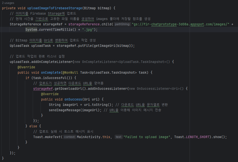 업로드가 완료되면 다운로드 URL을 얻어와서 이를 이용해 메시지 보내는 역할
