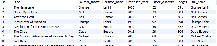 select title, pages, concat_ws(' ', author_fname, author_lname) full_name